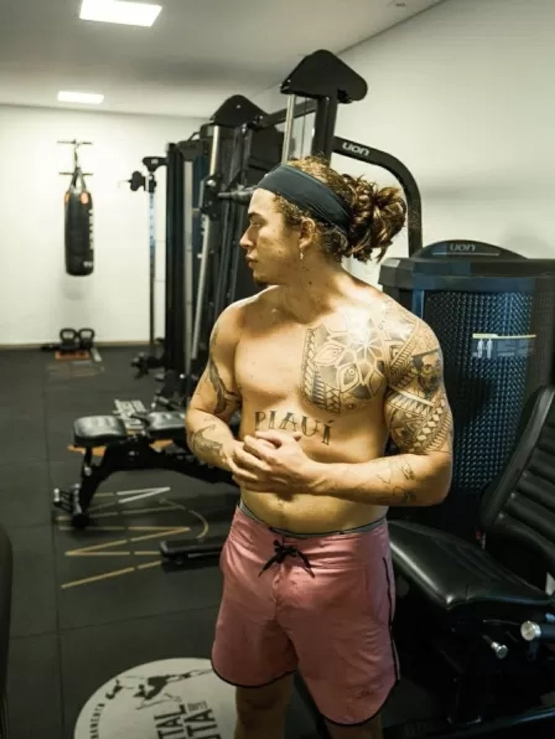 Nas imagens, o ator aparece sem camisa e com os cabelos presos. Também é possível ver diversos equipamentos de treino, inclusive, um saco de pancadas, usado para a prática de artes marciais. O espaço foi projetado no primeiro andar da mansão onde Whindersson mora com sua noiva, Maria Lina.